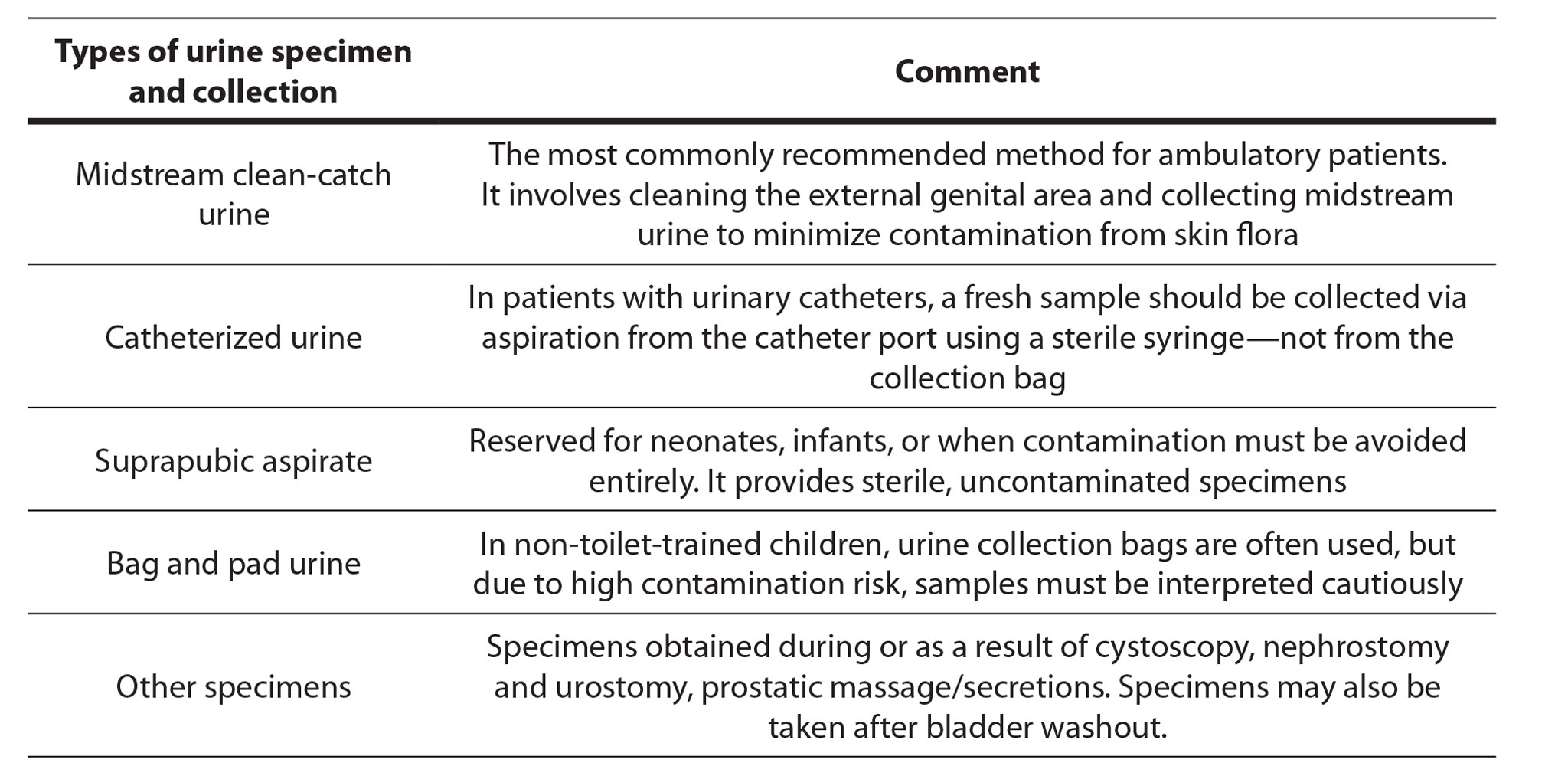 Table 1. Types of urine specimens and their relevance in diagnostic testing